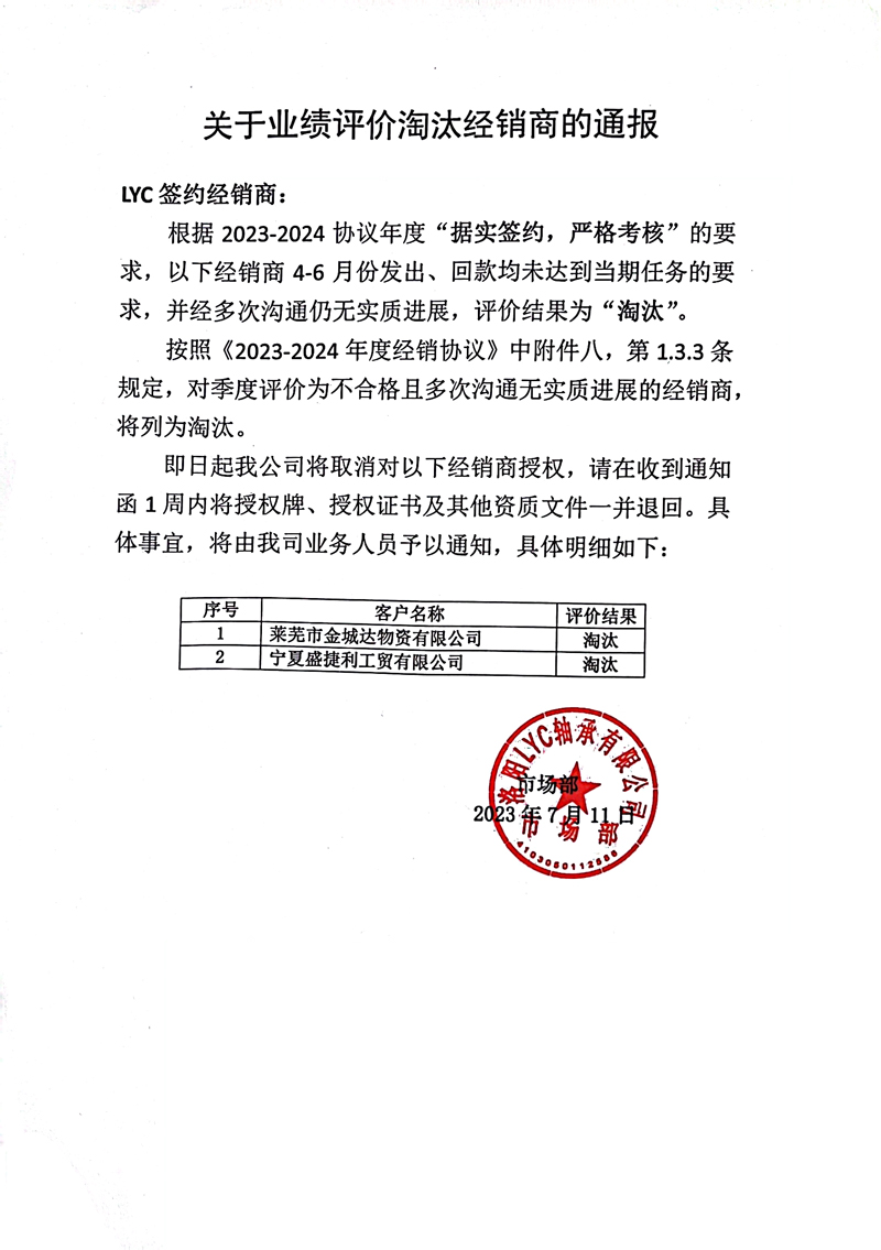 關于4-6月份業績評價不合格經(jīng)銷商的通報唱器