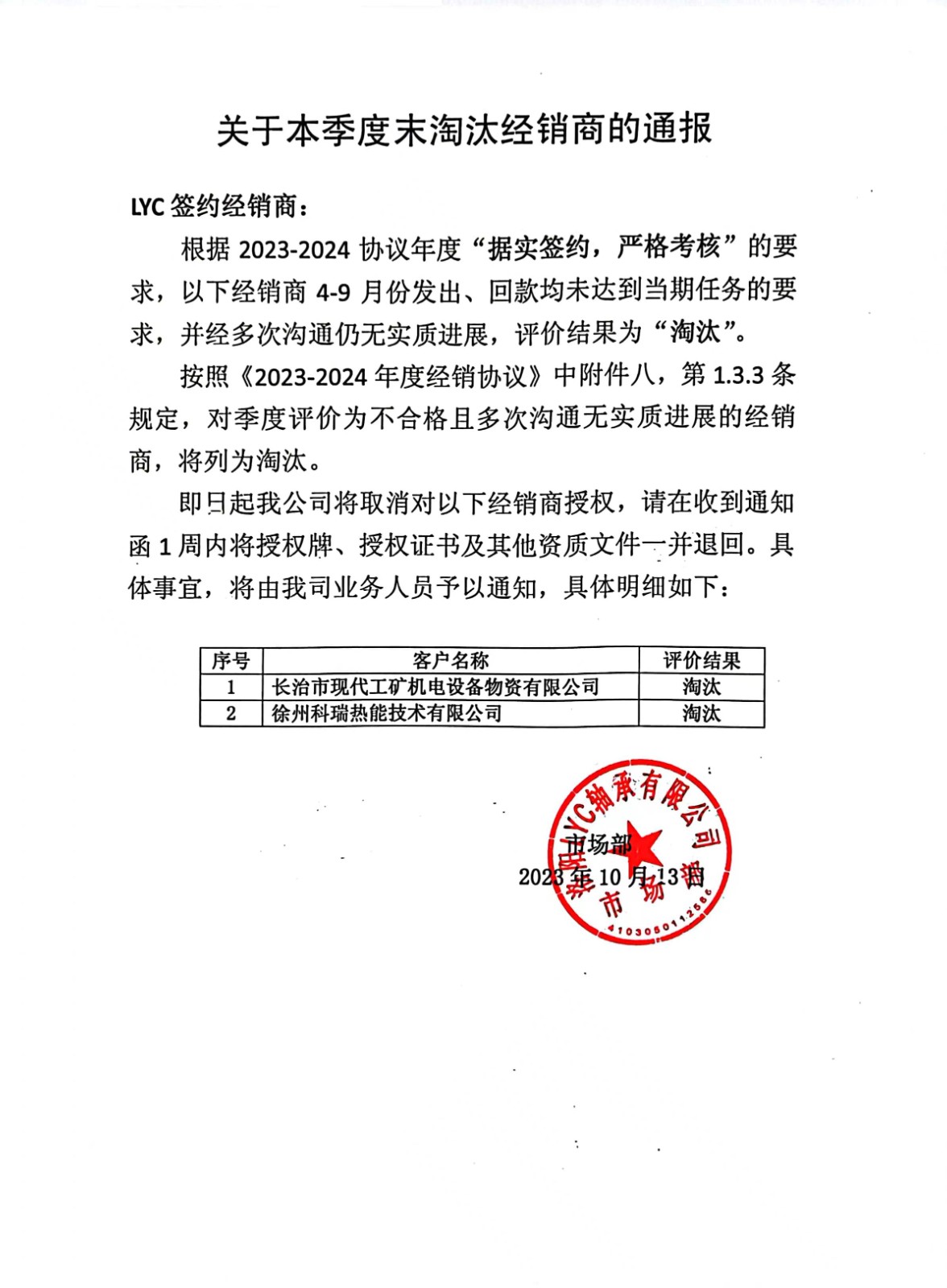關于本季度末淘汰經(jīng)人友銷商的通報