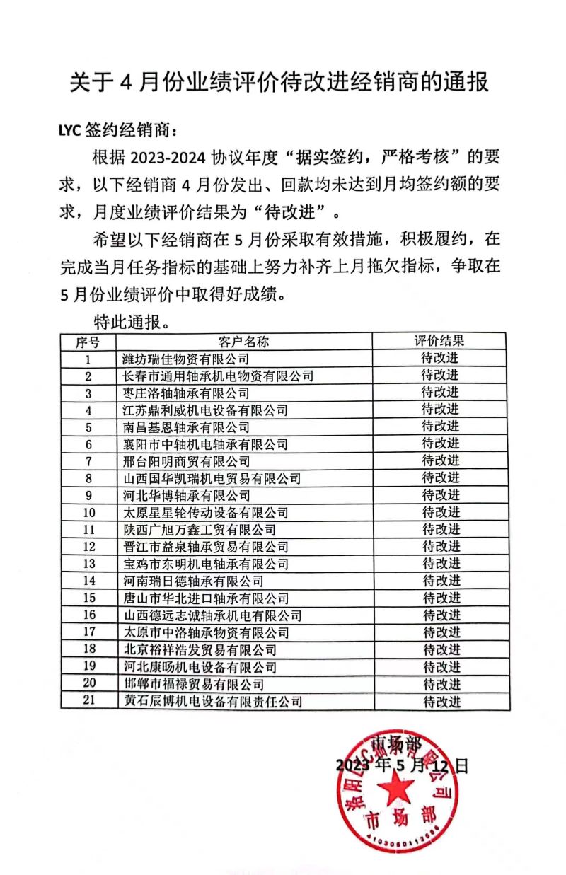 關于4月份業績評價待改進(jìn)經(jīng)銷商的通報