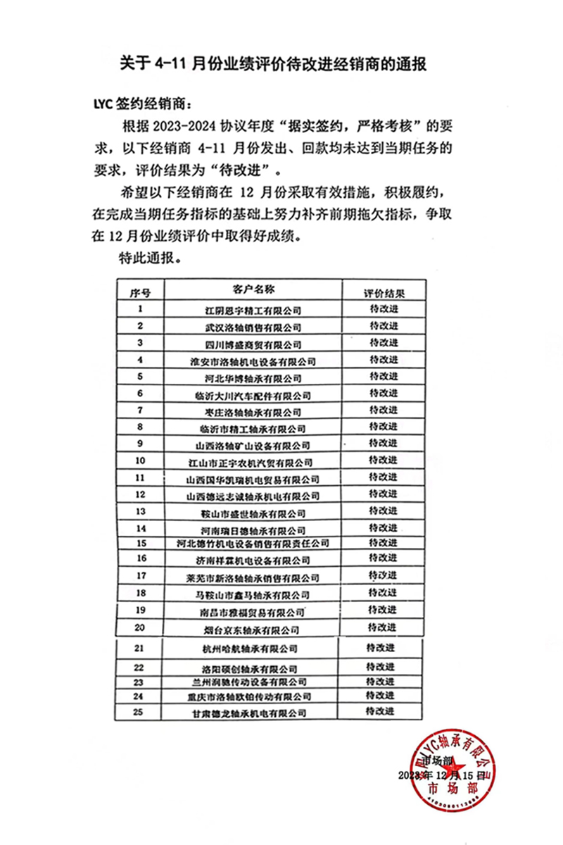 關于4-11月份業績評價待改進(jìn)經(jīng)銷商的通報
