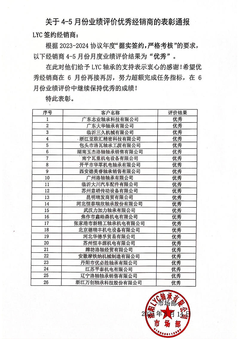 關于4-5月份業績評價優秀經(jīng)銷商的表彰通報
