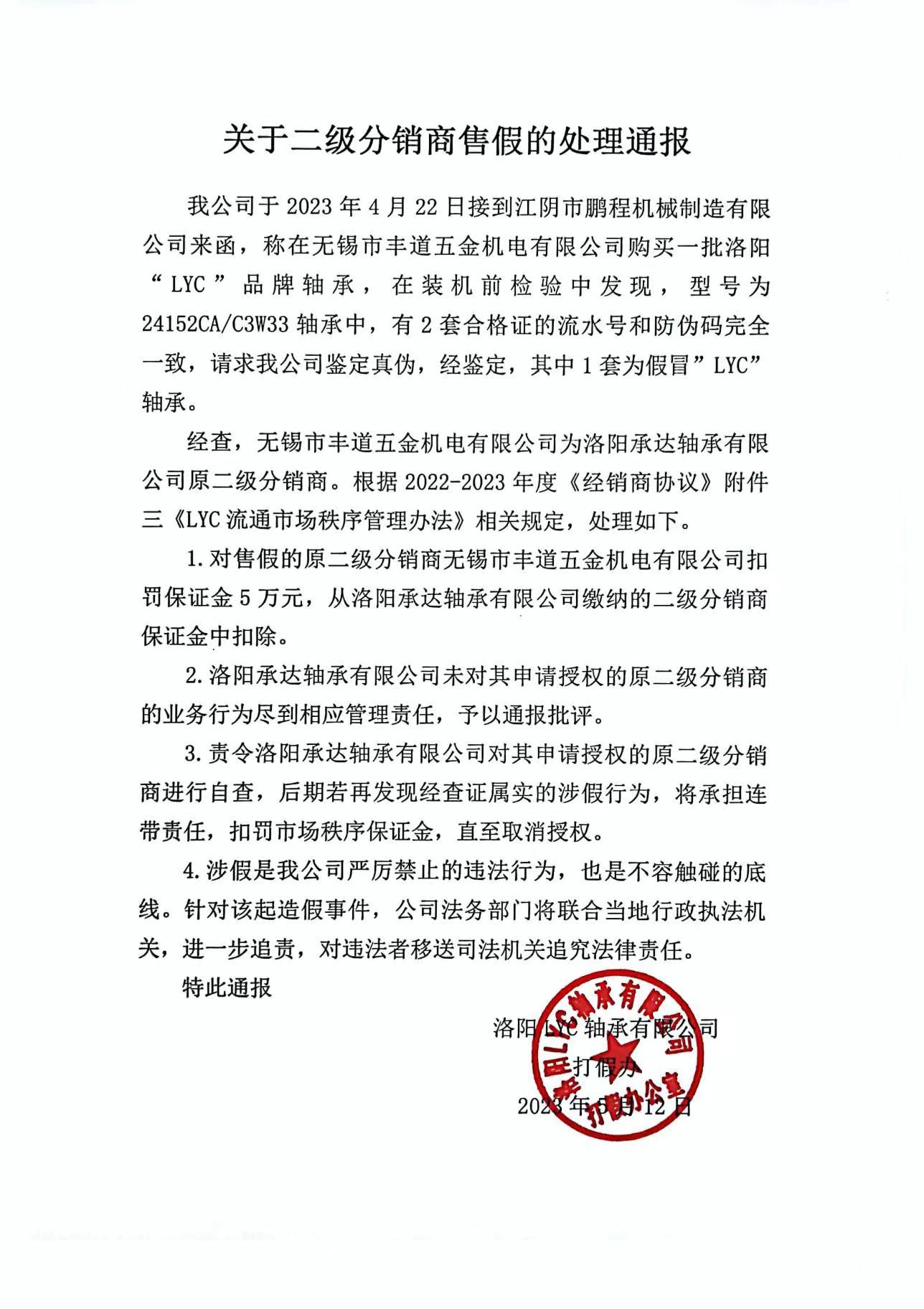 關于二級分銷商售假的處理通報