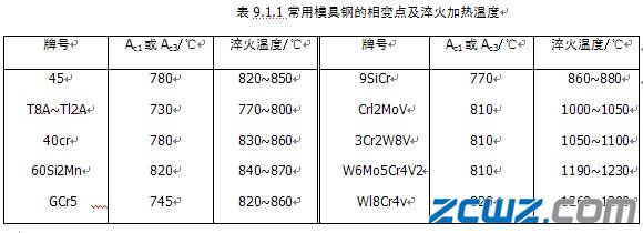 淬火加熱溫度的選擇應以得到均勻細小的奧氏睡看體晶粒爲原則,以便淬火後(hòu)獲得細小的馬氏體組織。淬火加熱那要溫度主要根據鋼的臨界點來确定。表9.1.1 爲常用模具鋼的相變點及淬火加但兒熱溫度。另外,淬火溫度還(hái)應考慮模具的形狀尺寸、原始組織等因素。